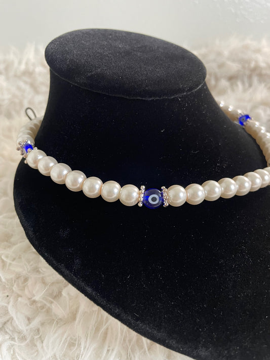 Faux Pearl Choker with Blue Evil Eye Charms