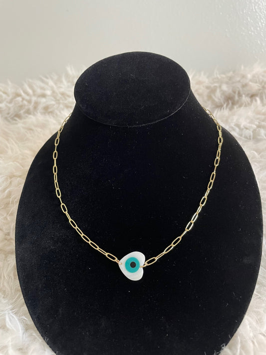 Silver Paper Clip Necklace with Rhodium Blue Evil Eye Pendant - Protective Elegance